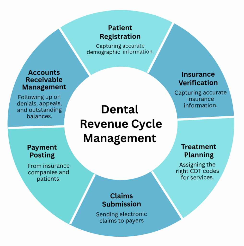 Dental RCM is the financial backbone of a practice that tracks patient care episodes from start to finish. It ensures that every service provided translates into accurate reimbursement. In dentistry, RCM typically involves:
