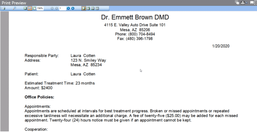 9. DentiMax also has a lending contract you can print from the reports screen that will outline your appointment policy, estimated treatment months and loan amount.